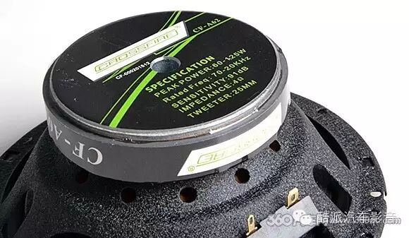 上述可见CF-A62定位和性能设定将稍低于CF-A65,既然针对快速无损安装升级,尺寸自然是惯例的25mm高音单元加上165mm的中低音单元。CF-A62用强化塑料外壳包裹球顶丝膜高音喇叭,设计上是流行的普遍外观设定。灰黑外壳在下方印上交叉火力的绿色logo,简约大气的设计足够表明其身份。喇叭的体积厚度就是为了原车高音喇叭位置的空间设计,加上配套的喇叭座,也能适用于外置专用座的安装方式。