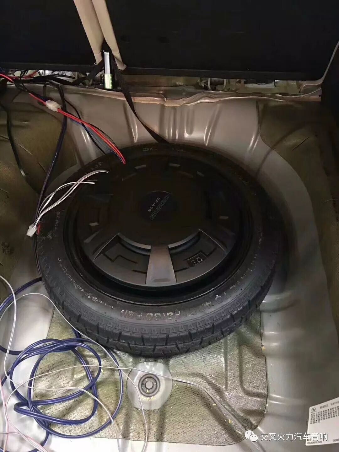 后尾箱还加装台交叉火力CF-A16大功率备胎炮,轻松地将这辆别克凯越打造成移动的音乐厅!